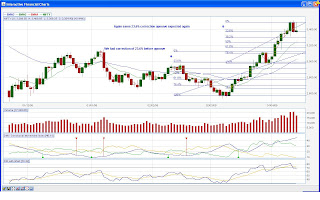On our Nifty front too a sort of same thing is going on. People haven't abandoned the hopes as market did rallied after rate cut news, but results were mixed as RBI cuts rates on repo and reverse repo but CRR one of the major rates was unchanged. We had a gap down opening and the gap was nicely filled up in the day as I discussed at iCharts shoutbox. Amid mixed reactions we peaked 3400 and managed to close down at 3365. Now an important suppord did held today which was 3300 (multiple support I must say - trend line, open interest and fib suuport of 38.2%). So as my last blog goes Nifty retraced more than 23% but candle still shows that its not in a hurry to move either downwards. Upper channel of Nifty is still intact but Open interest which is built up for the first time on 3400 and 3500 calls are giving clear signal that we might end up in 3200-3500 range as nothing major is happening. Q4 earnings are a bit of mixed bag as Infosys gave the indication that I.T front will be gloomy but TCS and some other software companies defied it amazingly reason may be their hedging policies, but yes they beated the market expectations. Hero Honda declared its results post closing and was in line with expectations. So on Automobile front we can be damn sure that they will post good results and same things can be expected from our Oil majors like Reliance and ONGC. Now its highly debated whether crude is breaking out or not but still these companies are performing better and expected to post decent results atleast better than their last quarter. Remember last time market didn't broke out on Reliance results and now this time its all good winds so a decent profit figures could cheer up the market as it is for the look out of anything good. So retesting of 3500 can't be denied at the month end and ofcourse yes we have our monthend fest named "Short Covering" which will be interesting to see. Till then lets see how volatile can market go.